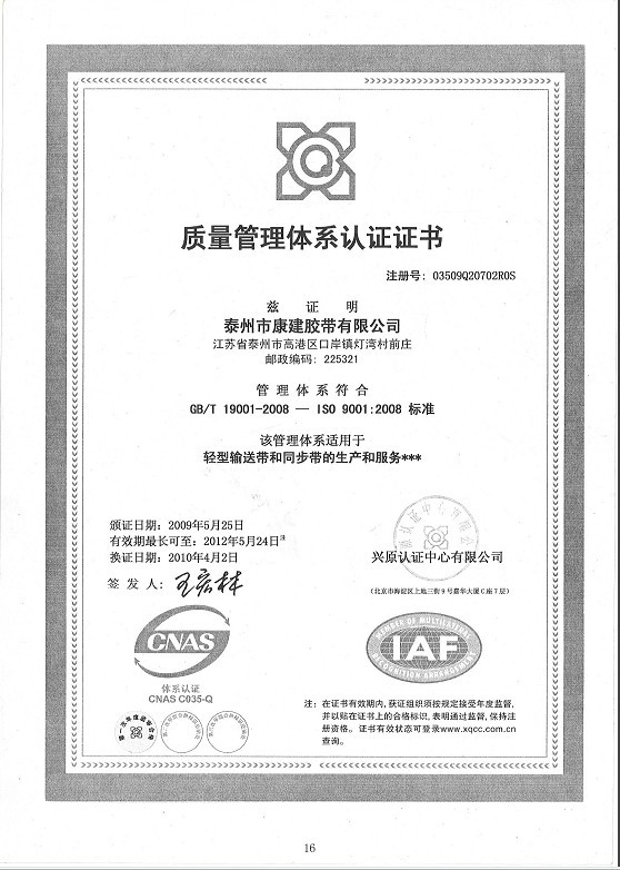 泰州市康建膠帶有限公司經(jīng)過(guò)十多年的發(fā)展已經(jīng)成為一家從事輸送帶和傳動(dòng)帶類(lèi)及相關(guān)設(shè)備生產(chǎn)和銷(xiāo)售的公司。位于中國(guó)經(jīng)濟(jì)發(fā)達(dá)的長(zhǎng)三角經(jīng)濟(jì)圈江蘇省泰州市高港區(qū),交通發(fā)達(dá)。我司以“合格的產(chǎn)品,滿意的服務(wù)”為宗旨,發(fā)揚(yáng)團(tuán)結(jié)、開(kāi)拓、拼搏爭(zhēng)先的創(chuàng)業(yè)精神,“康建”在全國(guó)行業(yè)樹(shù)立了良好的企業(yè)形象。“康建”產(chǎn)品已通過(guò)ISO9001國(guó)際質(zhì)量體系認(rèn)證,從原料﹑工藝等方面進(jìn)行了嚴(yán)格的控制,從而確保了產(chǎn)品質(zhì)量的穩(wěn)定可靠,成為各......
